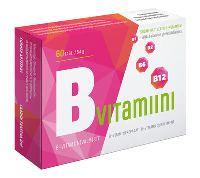 SuomenApteekin B-vitamiinion tehokas B-monivitamiinivalmiste joka sisältää kaikki ihmiselle tarpeelliset B-vitamiinit. Erityisesti B12-vitamiinin riittävään saantiin on valmisteen suunnittelussa kiinnitetty erityistä huomiota. B12 vitamiinilla on erityisesti muistamista ja keskushermoston normaalia toimintaa edistäviä vaikutuksia. Suomen Apteekin B-vitamiinilla saat tehokkaasti kaikki tarpeelliset B-vitamiinit,jotka toimivat tärkeinä elämän rakennuspalikkoina. Tällä yhdellä tehopillerillä korvaat kaikki muut vain yhtä B-vitamiinia sisältävät ravintolisät. Monien valmisteiden käyttämisen sijaan harkitse ottavasi kaikki B-vitamiinit kerralla yhdellä tabletilla.